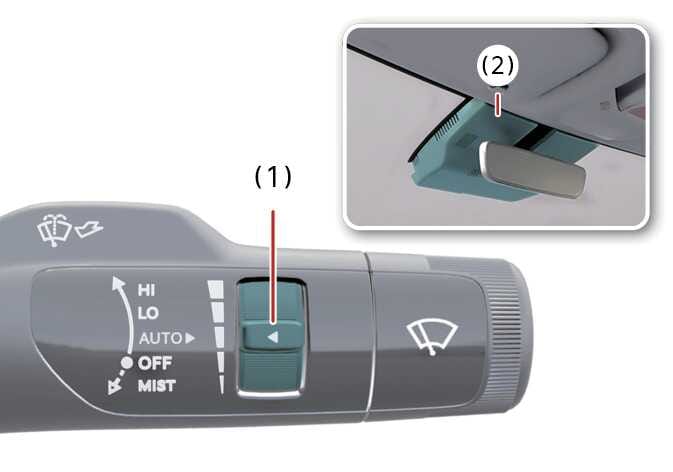 와이퍼 속도 기준 변경 스위치(1)를 돌려 와이퍼 속도를 조절하십시오. 위쪽으로 돌리면 속도가 빨라지고 아래쪽으로 돌리면 속도가 느려집니다.
