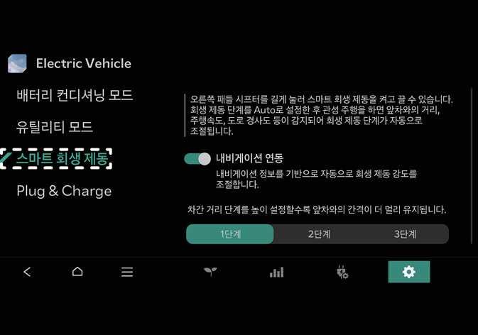 스마트 회생 제동 강도 N_CT25Z235 인포테인먼트 시스템의 Electric Vehicle > > 스마트 회생 제동 > 스마트 회생 제동 거리 단계에서 운전자의 거리 단계( 1단계/ 2단계/ 3단계)에 맞춰 앞 차와의 거리를 조절합니다.