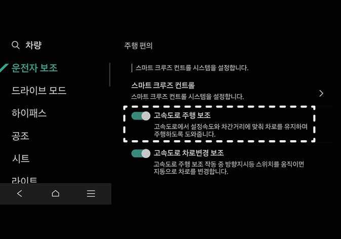 고속도로 차로변경 보조 기능을 선택하면 안전하게 차로를 변경하도록 도와줍니다. |