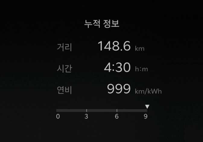 누적 정보를 초기화한 이후의 누적 주행 거리/시간/전비가 표시됩니다. 정보를 초기화하려면 스티어링 휠의 OK 버튼을 길게 누르십시오. |