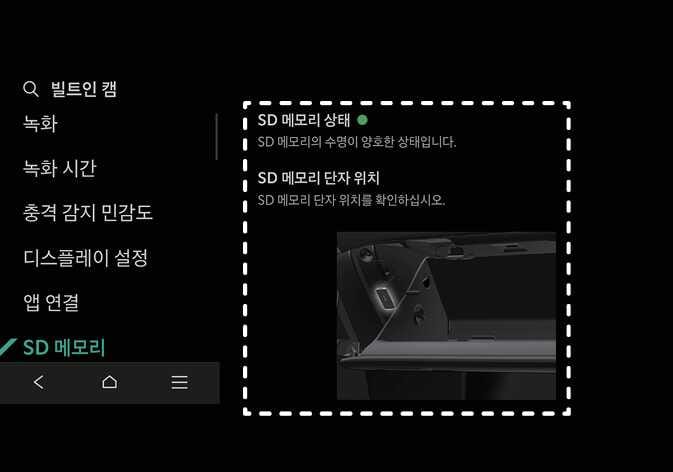 녹화 영상 저장을 위한 SD 메모리의 수명 상태, SD 메모리 단자 위치를 확인할 수 있습니다. SD 메모리를 안전하게 제거하지 않는 경우 저장된 파일 또는 파일 시스템이 손상될 수 있습니다. 연결 해제를 선택한 후 메모리를 안전하게 제거하십시오. SD 메모리를 초기화할 경우 저장된 모든 파일이 삭제되니, 초기화 이전에 보관이 필요한 파일은 필히 백업해 주십시오. |