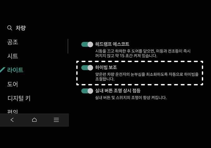 하이빔 보조 시스템을 설정할 때에는 반드시 안전한 곳에 정차한 후 조작하십시오.