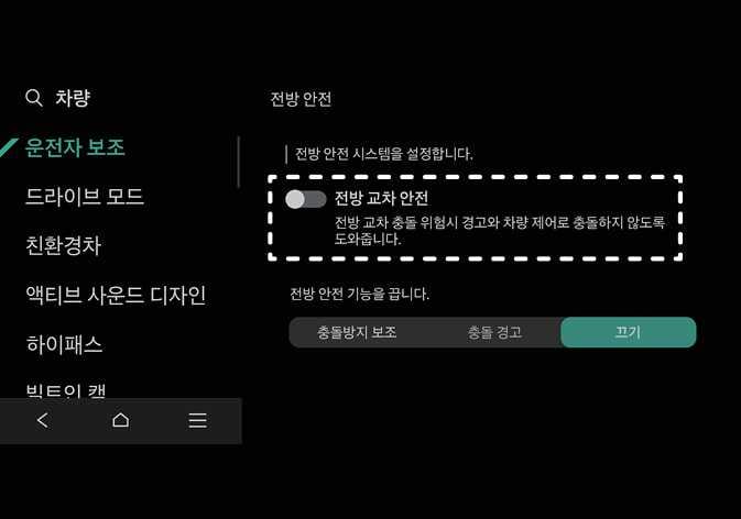 전방 교차 안전: 교차 차량 대응 기능이 작동합니다. 전방 안전이 선택되어야 선택할 수 있습니다.
