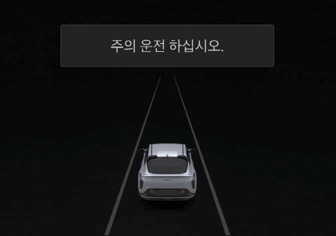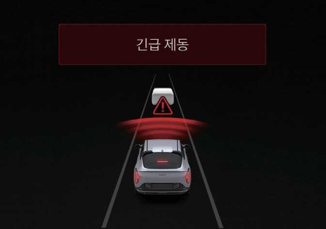 긴급 제동으로 정차 시 클러스터 등에 경고문이 표시됩니다. 안전을 위해 즉시 브레이크 페달을 밟고 주변 상황을 확인하십시오.