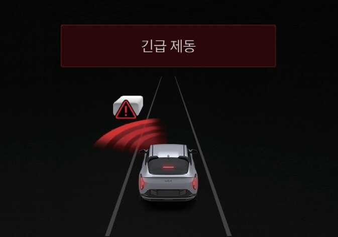 긴급 제동으로 정차 시 클러스터 등에 경고문이 표시됩니다. 안전을 위해 즉시 브레이크 페달을 밟고, 주변 상황을 확인하십시오.