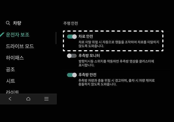 차로 안전 선택을 해제하면 차로 이탈방지 보조의 도움을 받을 수 없습니다. 항상 주의하여 운전하십시오.