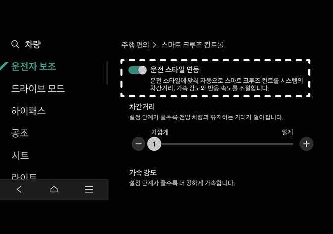 운전자 스타일 연동 활성화 및 비활성 시 표시되는 운전자의 주행 성향(차간거리, 가속 강도, 반응 속도)의 단계가 같더라도 제어되는 성향은 다를 수 있습니다.