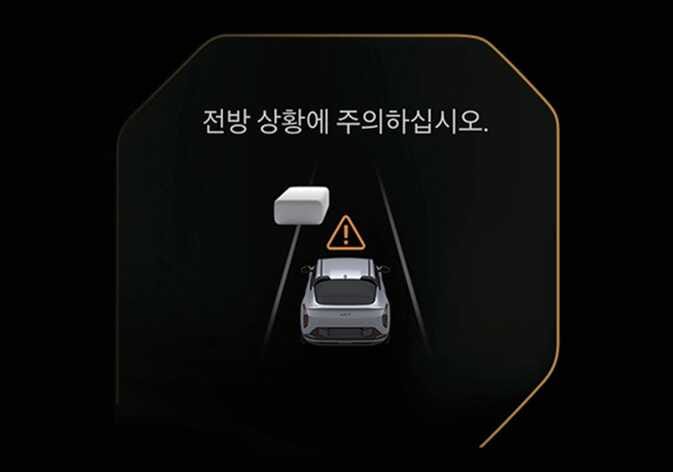 전방 상황 주의 알림이 발생하면 새롭게 나타난 전방의 차량이나 물체와 충돌할 수 있습니다. 전방 도로 상황 및 주행 상태를 확인하고 필요하면 브레이크 페달을 밟아 직접 속도를 조절하십시오.