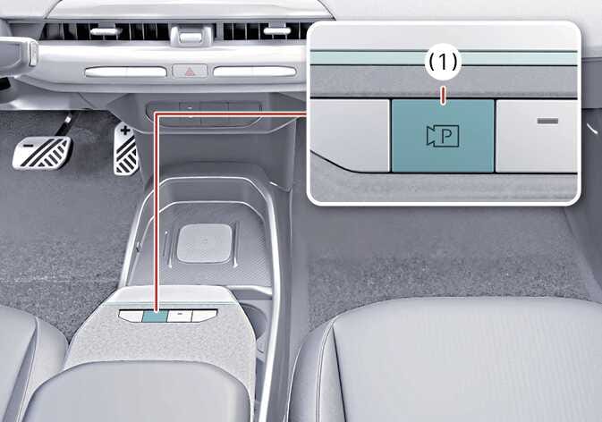 P(주차), D(주행) 또는 N(중립) 위치에서 주차/뷰 버튼(1)을 눌러 후방 모니터를 켜거나 끌 수 있습니다.