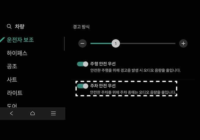 경고 방식은 DRIVE READY 상태에서, 인포테인먼트 시스템의 설정 > 차량 > 운전자 보조를 차례로 선택하십시오. (경고 방식)을 설정할 수 있습니다.