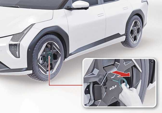 휠 및 타이어 탈착 시 타이어 임시 수리 장치 안에 있는 전용 리무버를 사용하여 휠 커버를 분리하십시오.