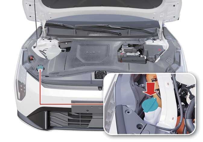 후드를 열고 워셔액 탱크의 캡을 여십시오.