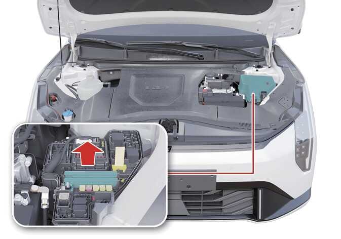 모터룸 퓨즈 박스 커버는 "딸깍" 소리가 날 때까지 닫아 확실하게 장착하십시오. 모터룸 퓨즈 박스 커버가 정상 체결되지 않으면 수분이 유입되어 전자 장치가 비정상적으로 작동할 수 있습니다.