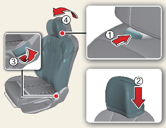 To lower the headrest, push and hold the release button (2) on the headrest support.