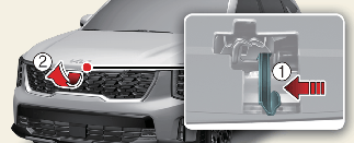 Go to the front of the vehicle, raise the hood slightly, push the secondary hood release lever (1) to the left and lift the hood (2).
