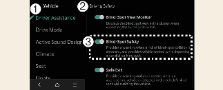 With the vehicle on, select Setup → Vehicle → Driver Assistance → Blind-Spot Safety on the infotainment system.
