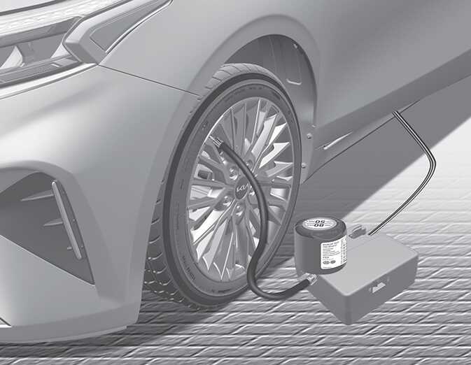 타이어 임시 수리 장치는 시동 상태에서 사용하십시오. 그러지 않으면 컴프레서 작동 시 차량 배터리 전원 사용으로 배터리가 방전될 수 있습니다.