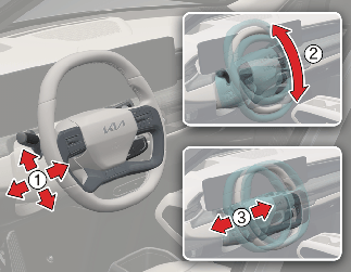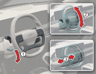 Adjust the steering wheel to the desired angle (2) and distance forward/back (3).