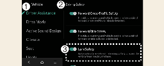 With the vehicle on, select Setup → Vehicle → Driver Assistance → Driving Safety on the infotainment system.