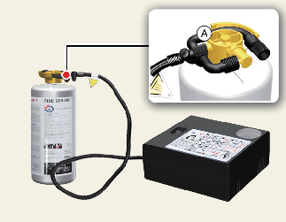 Connect the compressor hose to the compressor hose connector, located on the sealant bottle (1). Make sure the sealant bottle is sitting upright.