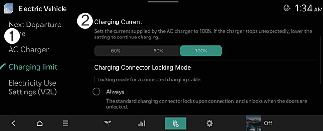 Bei manchen AC-Ladegeräten mit hoher Kapazität (Ladegeräte mit einer Stromkapazität, die größer ist als die Stromkapazität, die das Fahrzeug aufnehmen kann) kann es sein, dass sich der Ladestrom nicht ändert, auch wenn die Einstellung geändert wird.