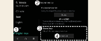 Wählen Sie Einstellung → Fahrzeug → Digitale Schlüssel → Smartphone-Schlüssel → Mein Smartphone-Schlüssel auf dem Bildschirm des Infotainment-Systems, während sich das Fahrzeug in der Stellung P (Parken) befindet.
