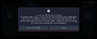 • 14 Minuten nach POWER ON erscheint auf dem Bildschirm des Infotainment-Systems die folgende Anzeige. Um den Strom des Fahrzeugs weiter zu nutzen, drücken Sie „In Standmodus wechseln“.