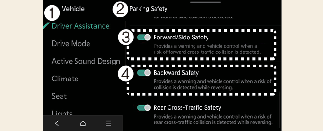 Berühren Sie bei eingeschaltetem Fahrzeug Einrichten → Fahrzeug → Fahrerassistenz → Parksicherheit auf dem Infotainment-System.