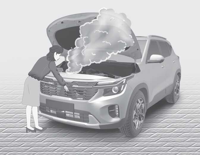 냉각수나 뜨거운 증기가 냉각수 탱크에서 흘러 나오면, 시동을 끄고 자사 직영 서비스센터 또는 서비스 협력사에 연락하십시오. 냉각수가 흘러나오지 않으면, 엔진을 계속 돌게 한 상태에서 후드를 열어 엔진 실내에 통풍이 잘 되도록 하여 엔진을 식히십시오. 엔진이 회전되면서 수온계가 떨어지지 않으면 시동을 끄고 냉각되도록 충분한 시간을 기다리십시오.