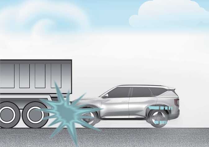 Heavy braking lowers the front portion of the vehicle causing it to "ride" under a vehicle with a higher ground clearance. Airbags may not inflate in this "under-ride" situation because deceleration forces that are detected by sensors may be significantly reduced by such "under-ride" collisions. |