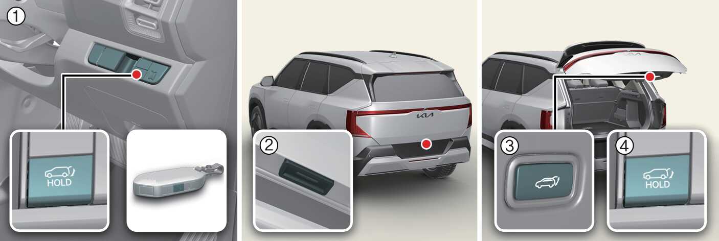 Press the power tailgate open/close button inside the vehicle or with the smart key for 1 second. The power tailgate opens with a warning sound.