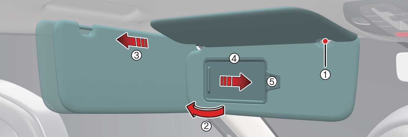 Slide the sun visor forward or backward (3) if necessary. Slide the mirror cover (4) to use the vanity mirror. The ticket holder (5, if equipped) is provided for the purpose of holding a tollgate ticket.