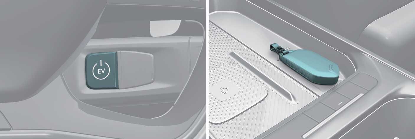 If the battery is weak or the smart key does not work correctly, place the smart key on the centre console where the key logo is located. Press the EV button for approximately 10 seconds whilst the vehicle is in ACC position. Press the EV button again whilst the vehicle is in OFF position.