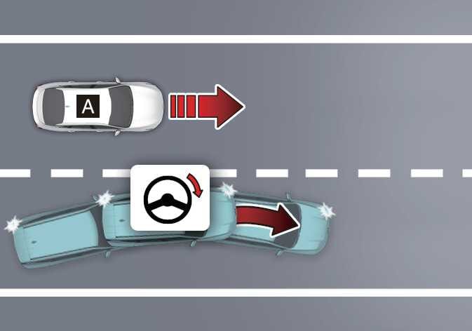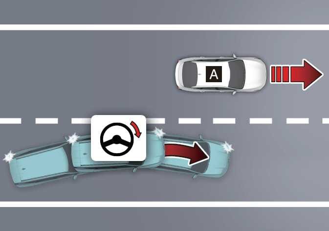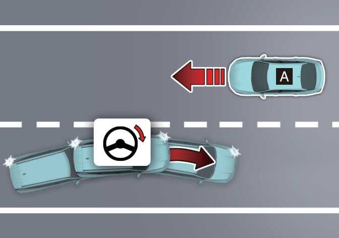 Junction Turning function can help avoid a collision with an oncoming vehicle, powered two-wheeler and cyclist in an adjacent lane when turning left (left-hand drive) or right (right-hand drive) at a crossroad with the turn signal on by applying emergency braking. |