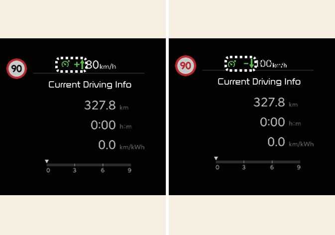 If the speed limit of the road changes during the operation of Manual Speed Limit Assist or Smart Cruise Control, an arrow in the direction of up or down is displayed to inform the driver that the set speed needs to be changed. At this time, the driver can change the set speed according to the speed limit by using the (+) or (–) switch on the steering wheel. |