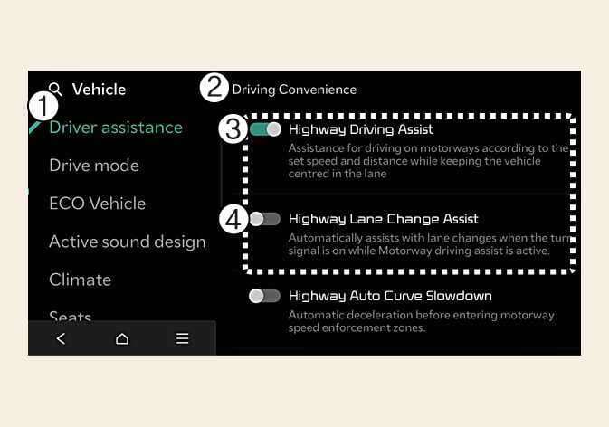 If Highway Driving Assist is selected, it helps maintain distance from the vehicle ahead, maintain the set speed, and helps centre the vehicle in the lane.