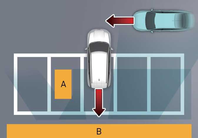 [A]: Structure, [B]: Wall Rear Cross-Traffic Collision-Avoidance Assist may detect vehicles passing by in front of you when parking in reverse into a parking space with a wall or structure in the rear or side area. If this occurs, the function may unnecessarily warn the driver and control the brake. Always check your surroundings whilst backing up. |