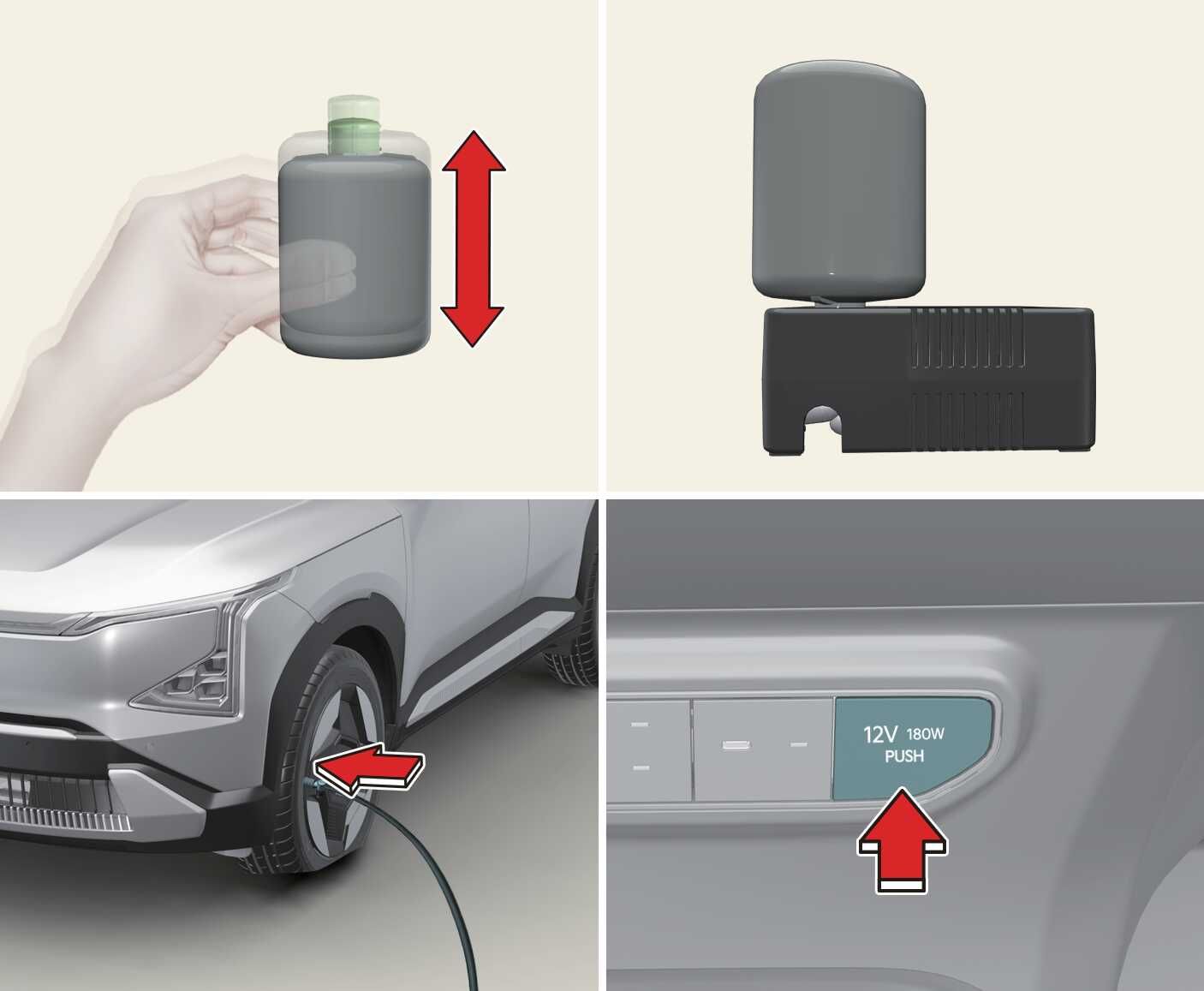After using it, leave the TMK (Tyre Mobility Kit) in place in the vehicle with the injection hose in the sealant bottle side and the injection hose in the compressor side assembled.