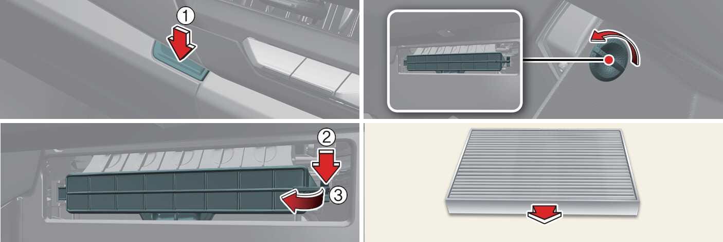 Remove the climate control air filter cover (2) by pulling out right side of the cover (3).