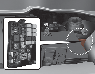 엔진룸 퓨즈 박스 커버를 닫을 시 락킹음을 확인해 커버 닫힘을 확인하십시오. 엔진룸 퓨즈 박스 커버가 정상적으로 체결되지 않으면 수분 유입으로 인한 전자장치의 비정상 작동이 발생할 수 있습니다.