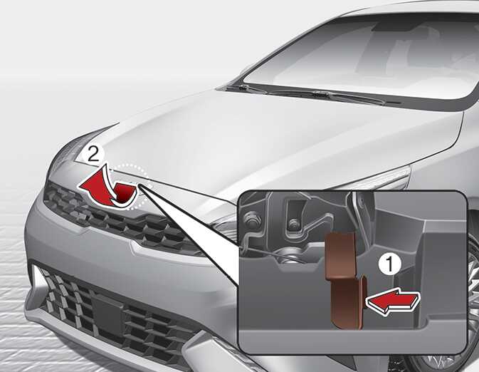 차량의 앞에서 엔진 후드를 약간 들어 올리고, 중앙에 위치한 잠금레버(1)를 왼쪽으로 밀고 있는 상태에서 후드(2)를 위로 들어 올리십시오.