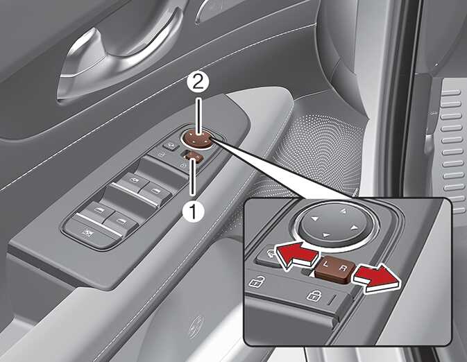 미러 조절 선택 스위치(1)를 오른쪽(R)으로 미십시오. 미러 조절 스위치(2) '▶' 부분을 눌러 아웃사이드 미러를 조절하십시오.