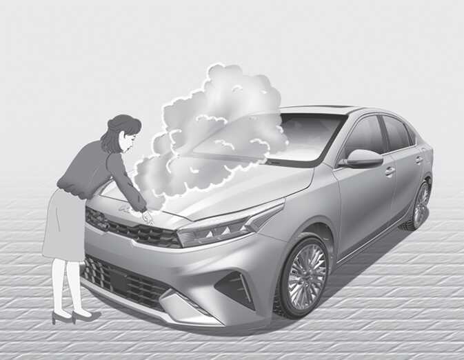 냉각수나 뜨거운 증기가 냉각수 탱크에서 흘러 나오면, 엔진을 멈추고 자사 직영 서비스센터 또는 서비스 협력사에 연락하십시오. 냉각수가 흘러나오지 않으면, 엔진을 계속 돌게 한 상태에서 후드를 열어 엔진 실내에 통풍이 잘되도록 하여 엔진을 식히십시오. 엔진이 회전되면서 수온계가 떨어지지 않으면 엔진을 멈추고 냉각되도록 충분한 시간을 기다리십시오.