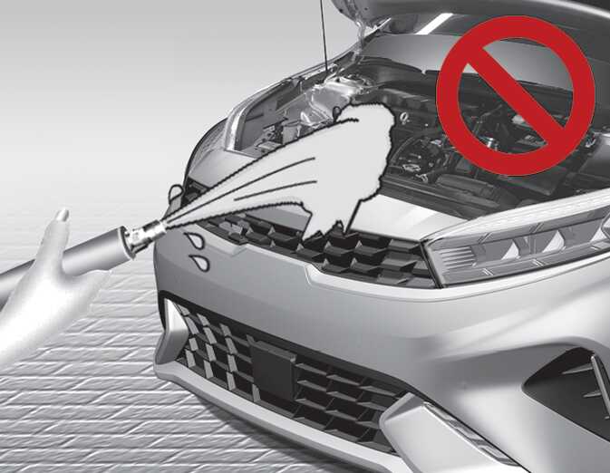 엔진룸 내를 물로 닦으면 (또는 고압 세차) 엔진룸 내 있는 전기회로 또는 에어덕트로 물이 유입되어 정상적인 차량운행이 불가능할 수 있습니다.