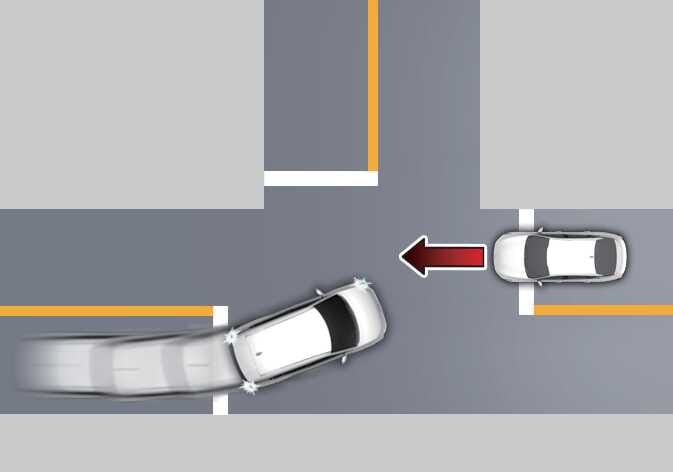 Die Funktion zur Kreuzungs-Kollisionsvermeidung verhindert beim Überqueren einer Kreuzung eine Kollision mit entgegenkommenden Fahrzeugen auf der linken oder rechten Seite durch eine Notbremsung. |