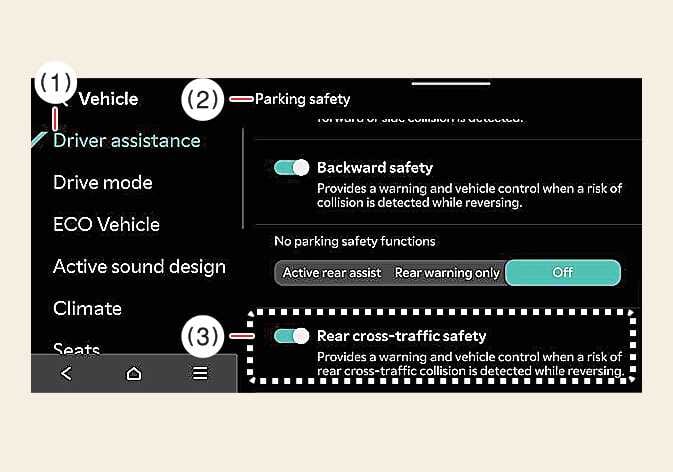 Wählen Sie bei Fahrzeug in DRIVE READYEinstellungen > Fahrzeug > Fahrerassistenz > Parksicherheit > Hinteres Querverkehr-Erkennungssystem auf dem Bildschirm des Infotainment-Systems, um den Heckverkehr-Kollisionsvermeidungsassistenten einzuschalten.