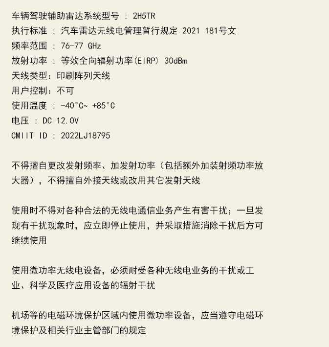 Die Funkfrequenzkomponenten (Eckradar vorn/Eckradar hinten) erfüllen folgende Anforderungen (ausstattungsabhängig):