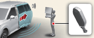 If you are positioned in the detecting area (within 12 ~ 24 in (30 ~ 60 cm) from the sliding door) carrying a smart key, the hazard warning lights will blink and chime will sound to alert you the smart key has been detected and the sliding door will open.