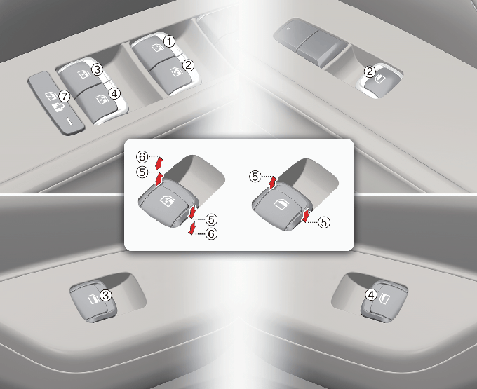 Each door has a power window switch that controls the door's window. The driver has a power window lock button which can block the operation of rear passenger windows. The power windows can be operated for approximately 3 minutes after ENGINE START/STOP button turned to the ACC or LOCK position. If the front doors are opened, the power windows cannot be operated even within the 3 minutes period.