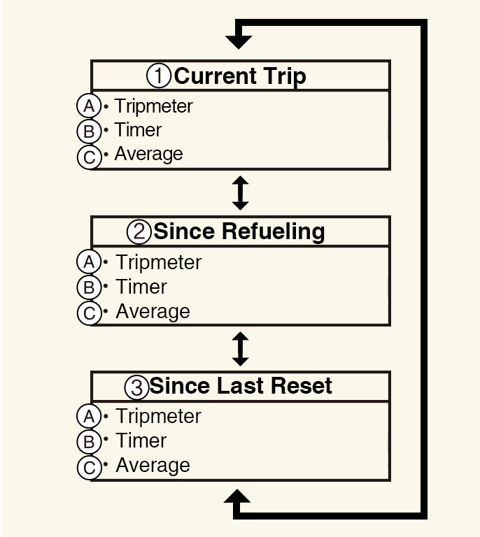 This display shows the trip distance, the average fuel efficiency, and the instant fuel efficiency (or the total driving time) since refueling.